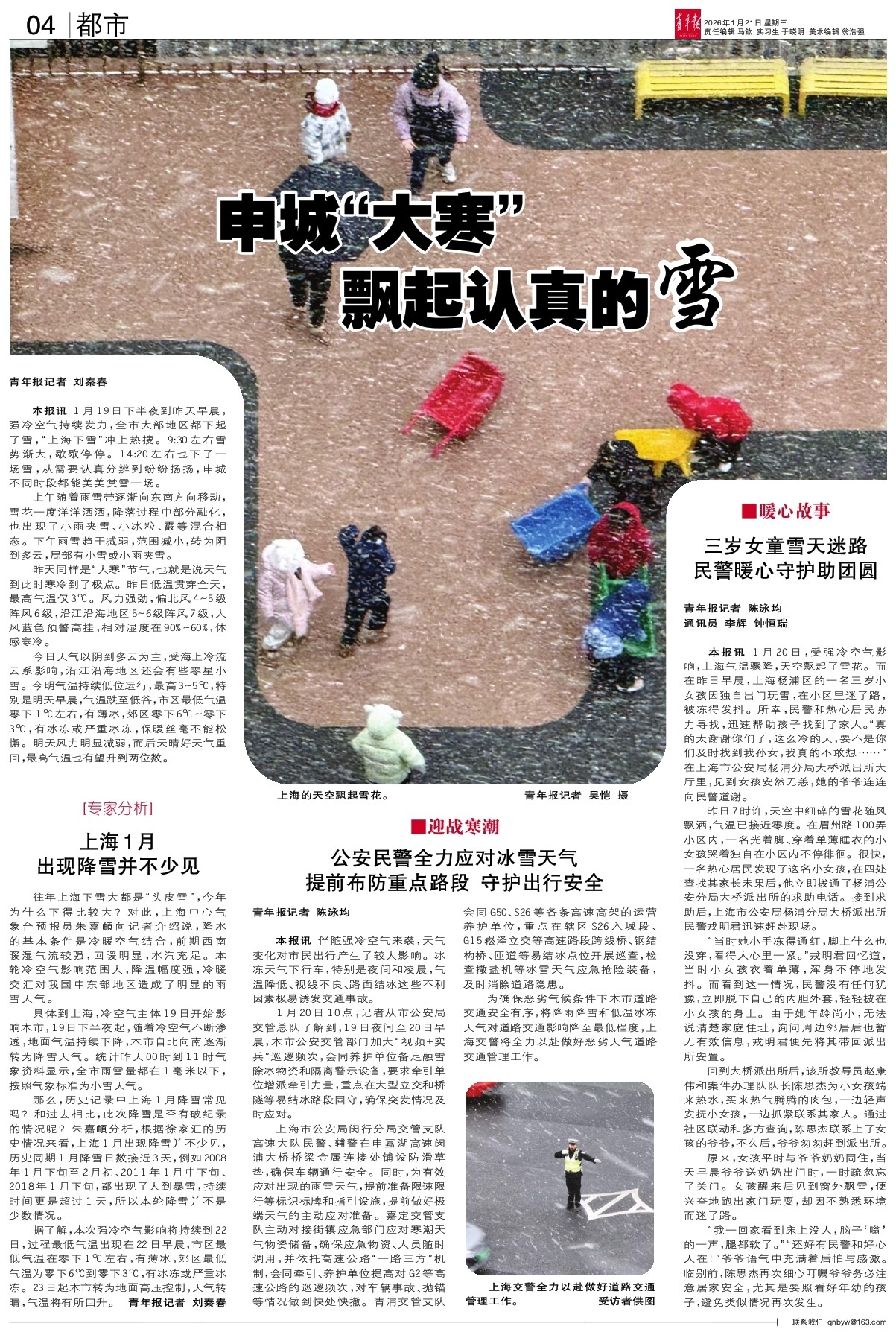 - 三岁女童雪天迷路 民警暖心守护助团圆 青年报记者 陈泳均 通讯员 李辉 钟恒瑞 本报讯 1月20日,受强冷空气影响,上海气温骤降,天空飘起了雪花。而在昨日早晨,上海杨浦区的一名三岁小女孩因独自出门玩雪,在小区里迷了路,