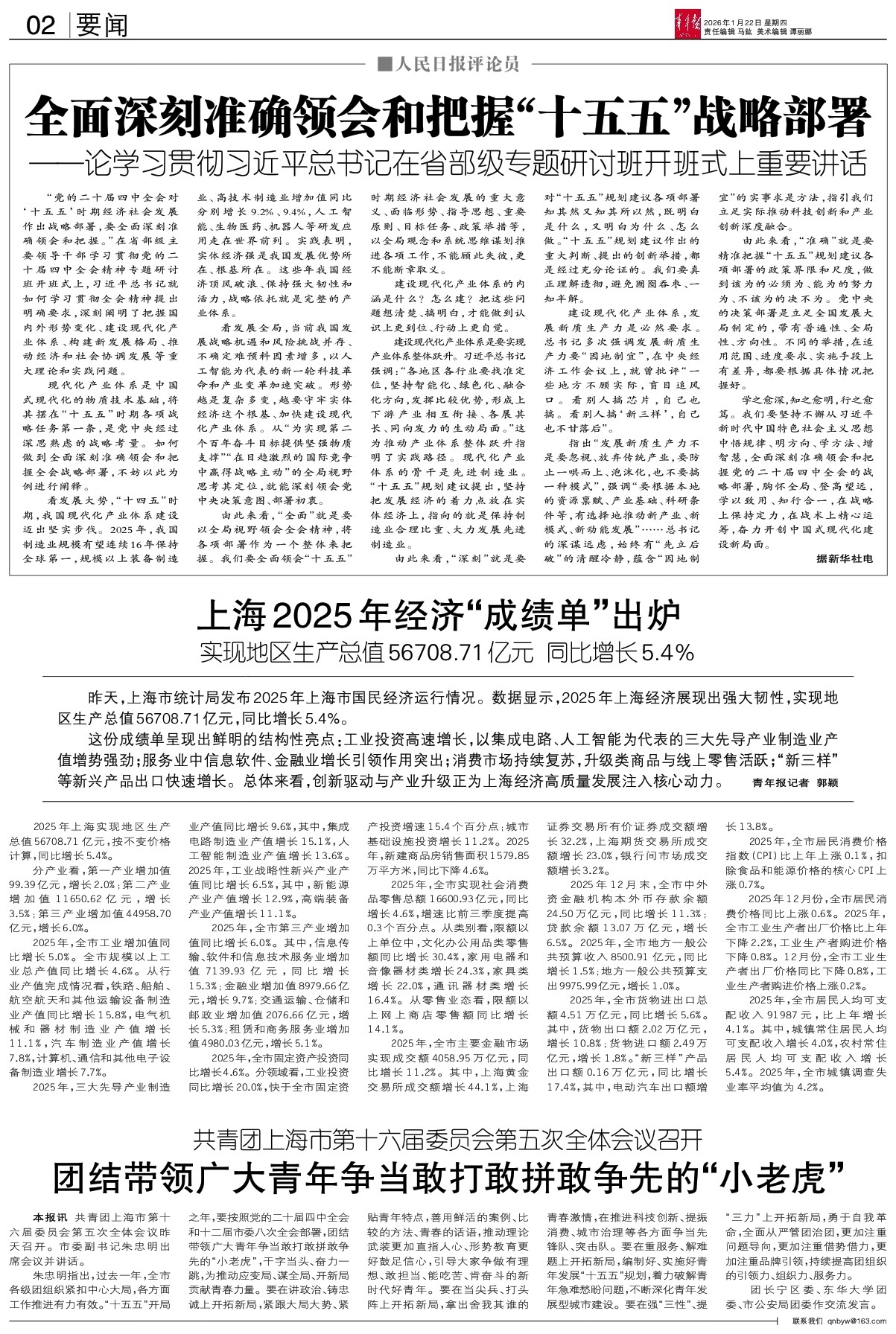 - 上海2025年经济“成绩单”出炉 昨天,上海市统计局发布2025年上海市国民经济运行情况。数据显示,2025年上海经济展现出强大韧性,实现地区生产总值56708.71亿元,同比增长5.4%。 这份成绩单呈现出鲜明的