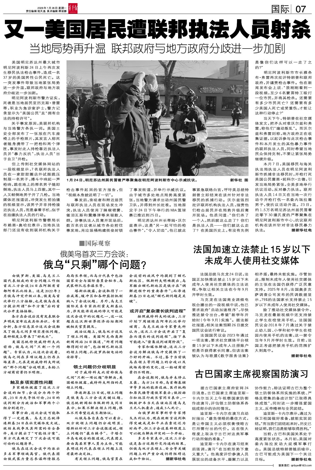 - 又一美国居民遭联邦执法人员射杀 美国明尼苏达州最大城市明尼阿波利斯24日上午再次发生移民执法枪击事件,造成一名37岁的美国男性公民死亡。这一突发事件导致当地紧张局势进一步升温,联邦政府与地方政府分歧进一步加剧。