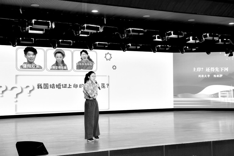 陈锐洢说,同济大学一直有脱口秀社团,这次正好有机会,就想尝试一下能不能把脱口秀与宣讲结合起来。“党的创新理论一直坚持从群众中来、到群众中去,我讲的贴纸条的故事,就是我们同济大学一位选调生学长真实的经历。”