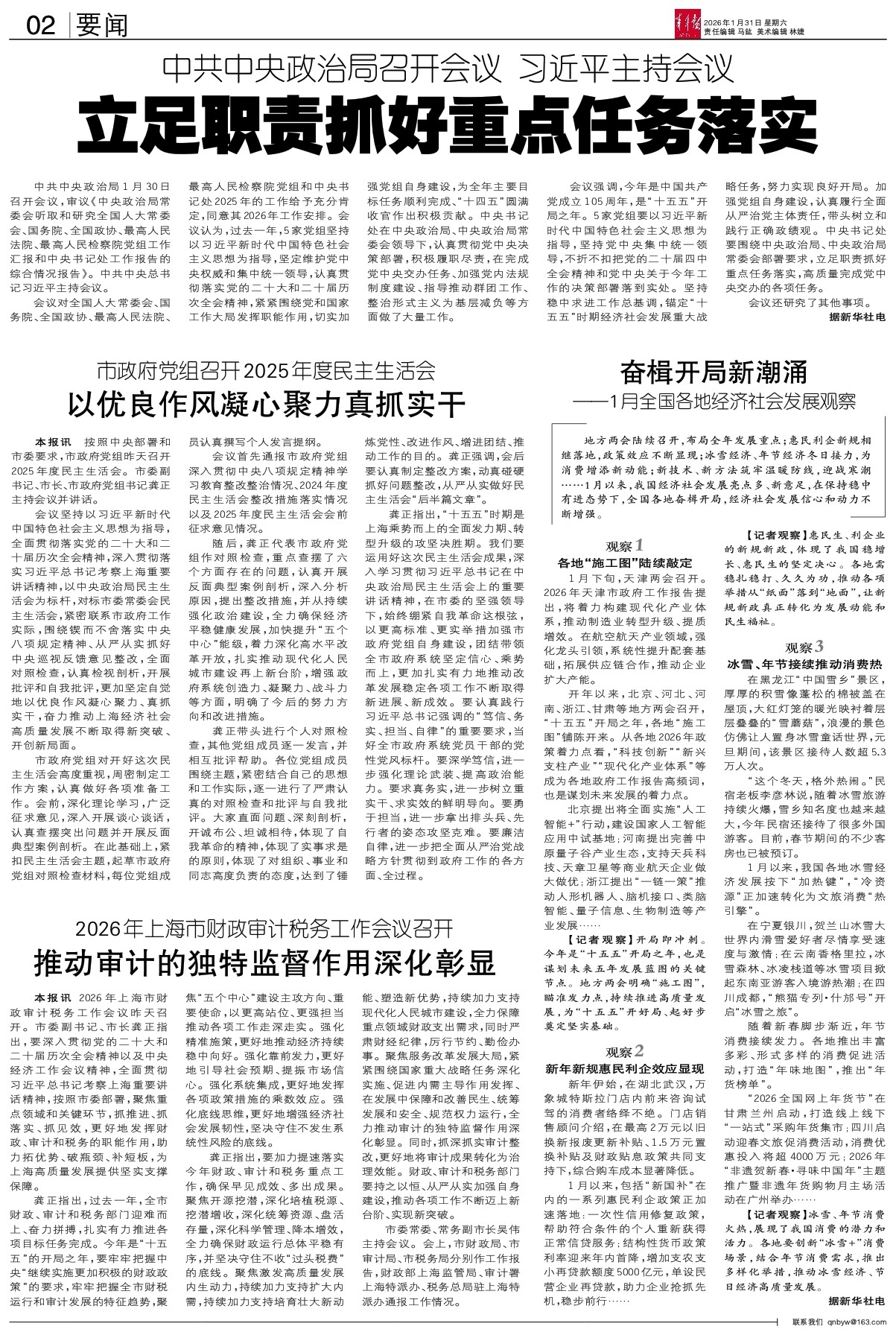 - 奋楫开局新潮涌 地方两会陆续召开,布局全年发展重点;惠民利企新规相继落地,政策效应不断显现;冰雪经济、年节经济冬日接力,为消费增添新动能;新技术、新方法筑牢温暖防线,迎战寒潮……1月以来,我国经济社会发展亮