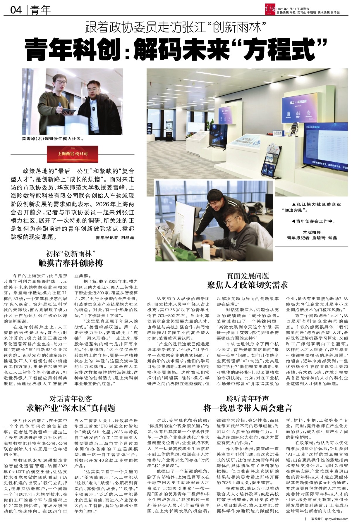 政策落地的“最后一公里”和紧缺的“复合型人才”,是创新路上“成长的烦恼”。面对来走访的市政协委员、华东师范大学教授姜雪峰,上海羚数智能科技有限公司联合创始人车轶就现阶段创新发展的需求如此表示