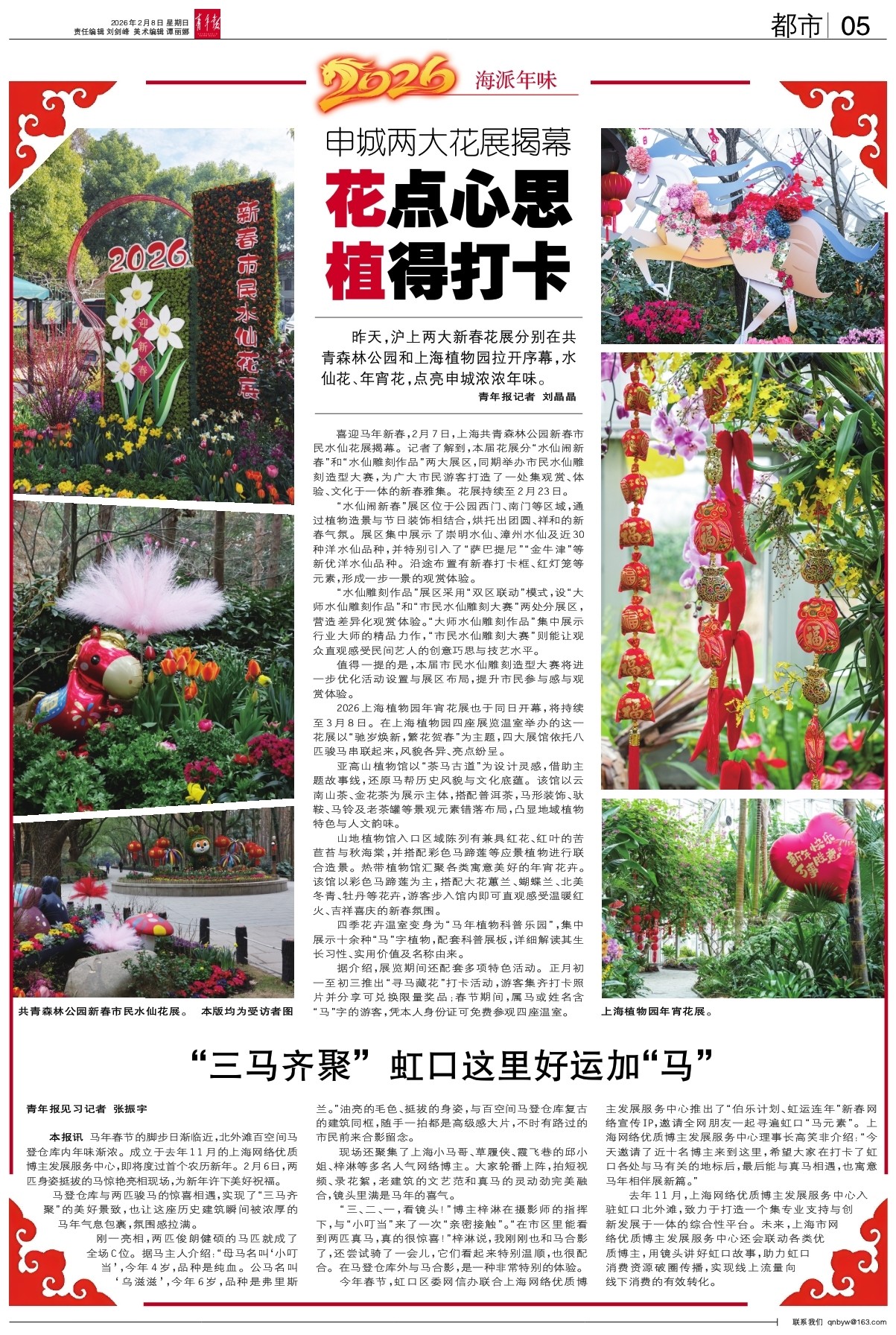 昨天,沪上两大新春花展分别在共青森林公园和上海植物园拉开序幕,水仙花、年宵花,点亮申城浓浓年味。 青年报记者 刘晶晶 喜迎马年新春,2月7日,上海共青森林公园新春市民水仙