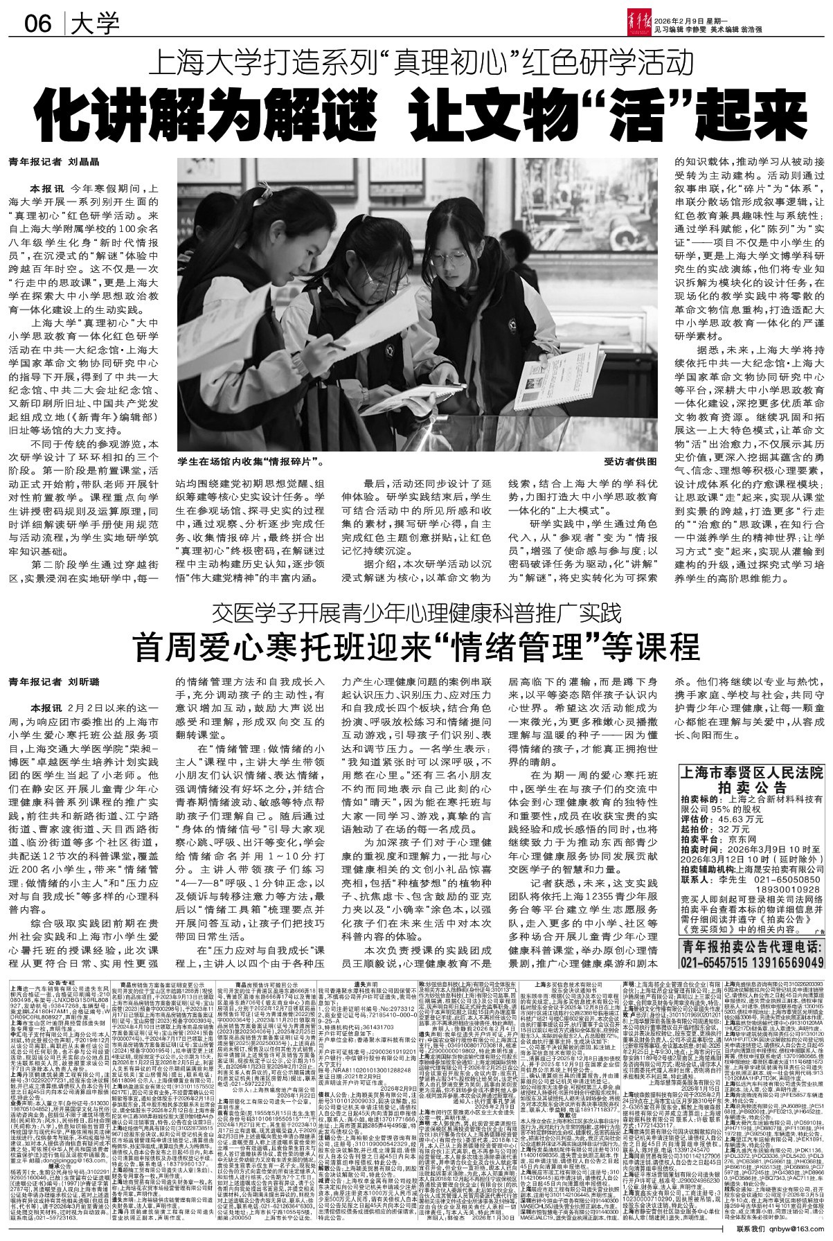 - 首周爱心寒托班迎来“情绪管理”等课程 青年报记者 刘昕璐 本报讯 2月2日以来的这一周,为响应团市委推出的上海市小学生爱心寒托班公益服务项目,上海交通大学医学院“荣昶-博医”卓越医学生培养计划实践团的医学生当起了小老师