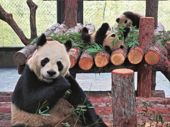 昨日上午,上海野生动物园里一场简约又温馨的大熊猫龙凤胎正式和游客见面启幕仪式上,园方宣布,自2月15日起,大熊猫“芊金”将带着龙凤胎“芊然”“芊逸”正式和广大公众见面,以憨态可掬的模样给市民带来别样年味。专程赶来的猫粉代表送上了特别的礼物和祝福,希望这对在上海诞生的“子二代”在春节期间成为申城最耀眼的“人气明星”之一。青年报记者 刘晶晶