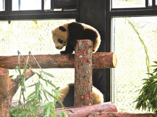 上午11时,在大熊猫母幼展区,记者看到了这对可爱的双胞胎。姐姐“芊然”和弟弟“芊逸”一点也不“怯场”,活泼好动,让人直呼好萌。它们一会儿在滑滑梯上灵活攀爬,一会儿在栖架上互动玩耍,时而碰头亲昵,时而追逐打滚,引得围观人群纷纷拍照记录。