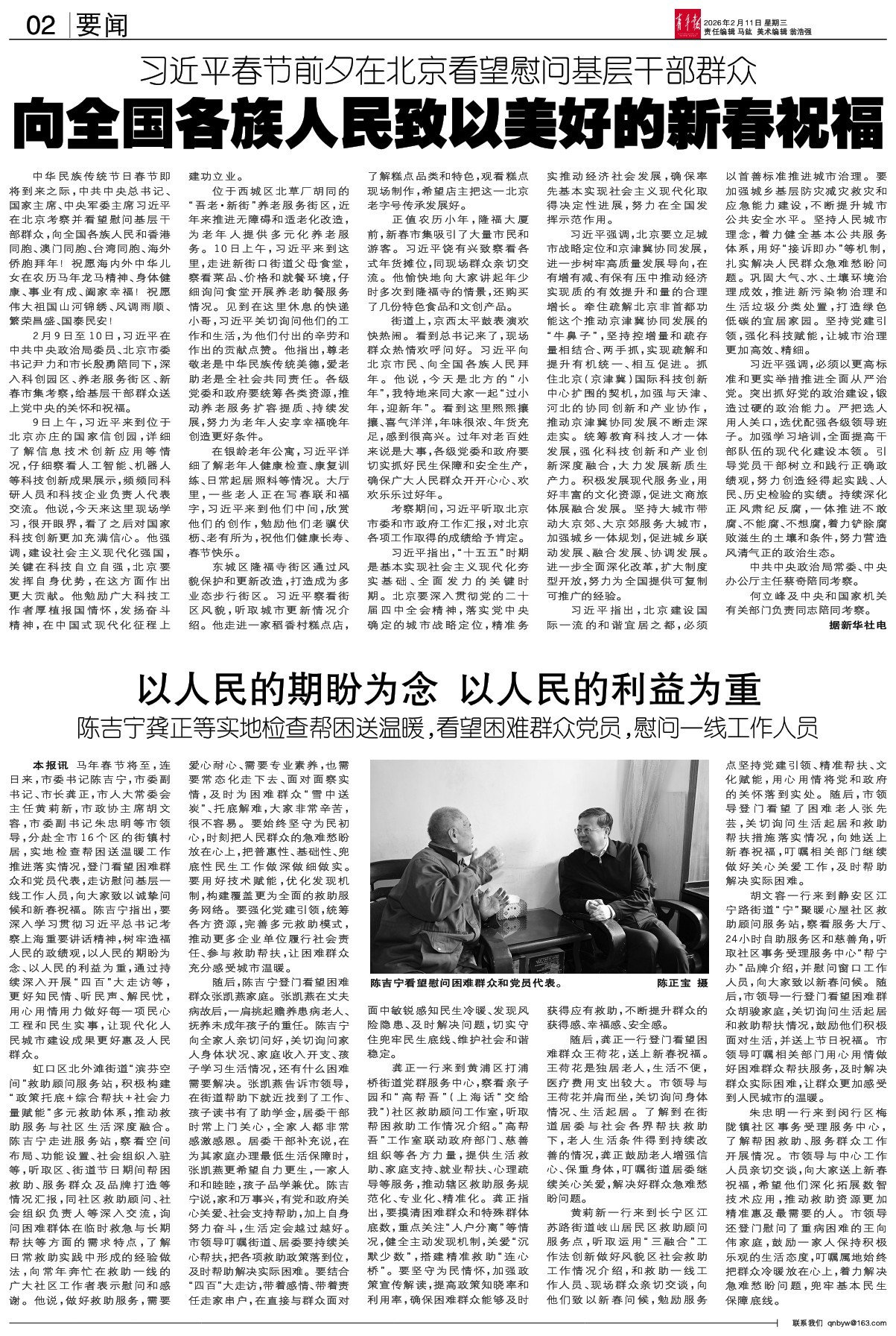 - 以人民的期盼为念 以人民的利益为重 本报讯 马年春节将至,连日来,市委书记陈吉宁,市委副书记、市长龚正,市人大常委会主任黄莉新,市政协主席胡文容,市委副书记朱忠明等市领导,分赴全市16个区的街镇村居,实地检查帮困送温暖工作推进