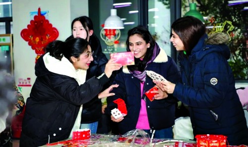 现场热闹的年俗活动吸引了不少留校学子踊跃参与。红灯笼高挂、福字点缀,猜灯谜、做窗花、投壶、写春联等经典项目依次铺开。同学们或凝神解谜,或巧手剪窗花,或趣味投壶互动,或挥毫写春联,将新春的美好期许凝于指尖、融于笔墨。不少国际生也主动加入,在亲身体验中探寻中国春节的文化底蕴,现场处处洋溢着团圆祥和的节日气息。