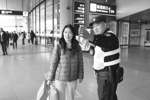 在巡逻的同时,仉颢宇会主动为旅客提供帮助。遇到行动不便的老人,他会主动上前,搀扶老人走到对应的上客点,细心叮嘱司机路上多加留意。遇到带着小孩的旅客,他还会帮家长拎一把行李箱,让家长能腾出手来照顾好孩子。