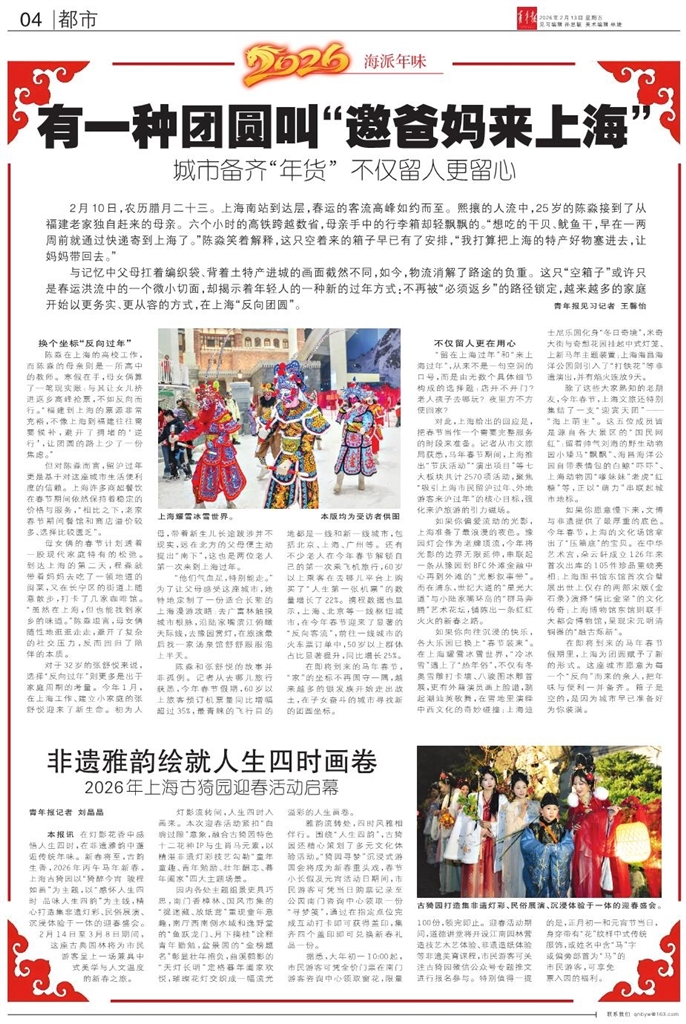 - 非遗雅韵绘就人生四时画卷 青年报记者 刘晶晶 本报讯 在灯影花香中感悟人生四时,在非遗雅韵中邂逅传统年味。新春将至,古韵生香,2026年丙午马年新春,上海古猗园以“猗醉今宵 骏程如画”为主题,以“感怀人生四时 品味人生