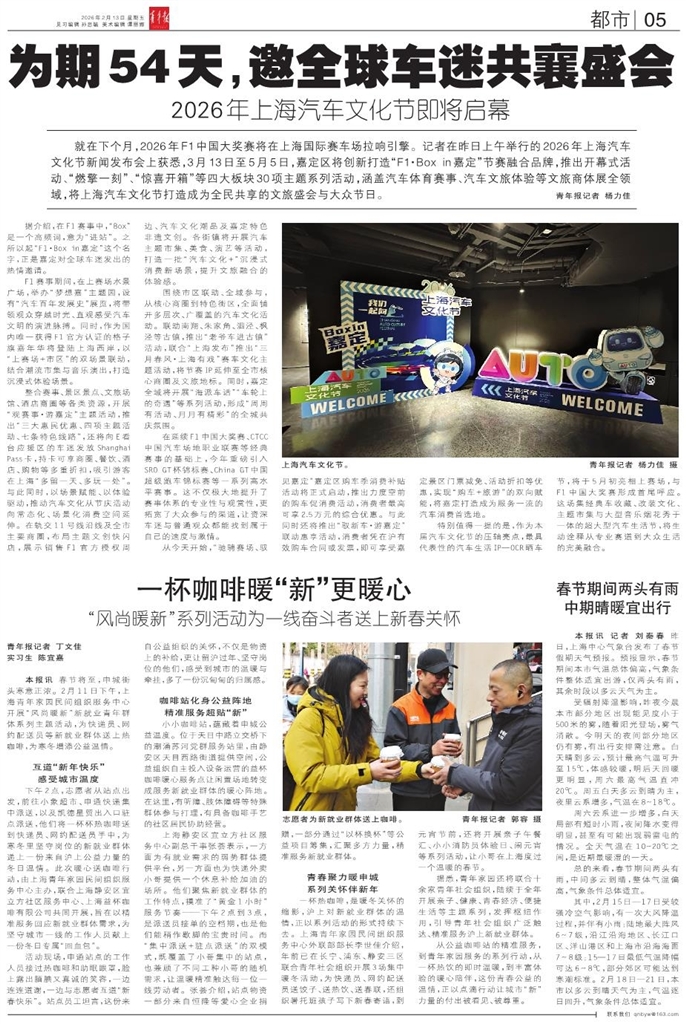 - 为期54天,邀全球车迷共襄盛会 就在下个月,2026年F1中国大奖赛将在上海国际赛车场拉响引擎。记者在昨日上午举行的2026年上海汽车文化节新闻发布会上获悉,3月13日至5月5日,嘉定区将创新打造“F1·Box in嘉定”节赛融