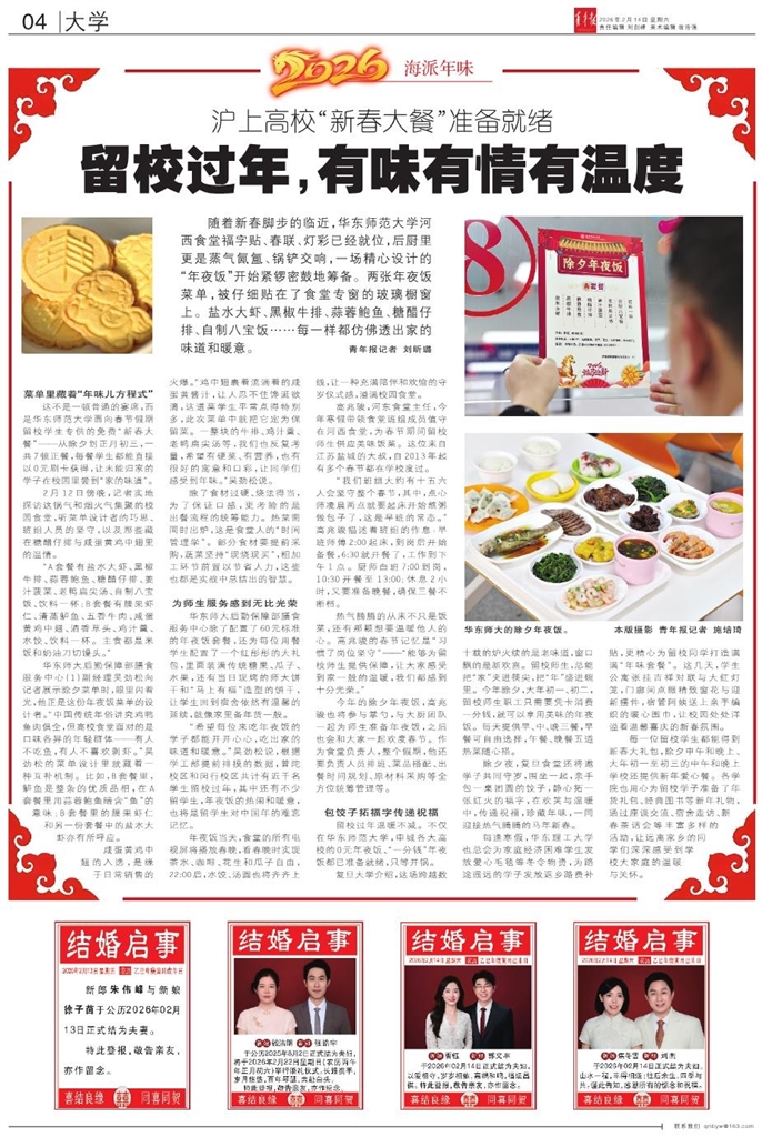 随着新春脚步的临近,华东师范大学河西食堂福字贴、春联、灯彩已经就位,后厨里更是蒸气氤氲、锅铲交响,一场精心设计的“年夜饭”开始紧锣密鼓地筹备。两张年夜饭菜单,被仔细贴在了食堂专窗的玻璃橱窗上。盐水