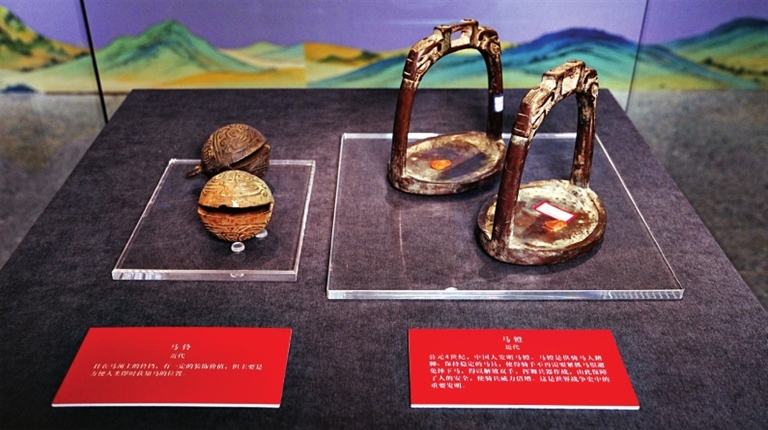 上海市历史博物馆策展人黄晓宾向青年报记者介绍,此马铃生产的具体年份和使用之地已无从考证,但马铃是挂在马颈上的铃铛,具有一定的装饰价值,主要是方便人类即时获知马的位置。而上历博馆藏的另一对同样产于近代的马镫则体现了中国人的智慧。黄晓宾告诉记者,公元4世纪,中国人发明马镫。马镫是供骑马人踏脚、保持稳定的马具,使得骑手不再需要紧抓马鬃避免摔下马,得以解放双手,挥舞兵器作战,由此保障了人的安全,使骑兵威力倍增。这是世界战争史中的重要发明。