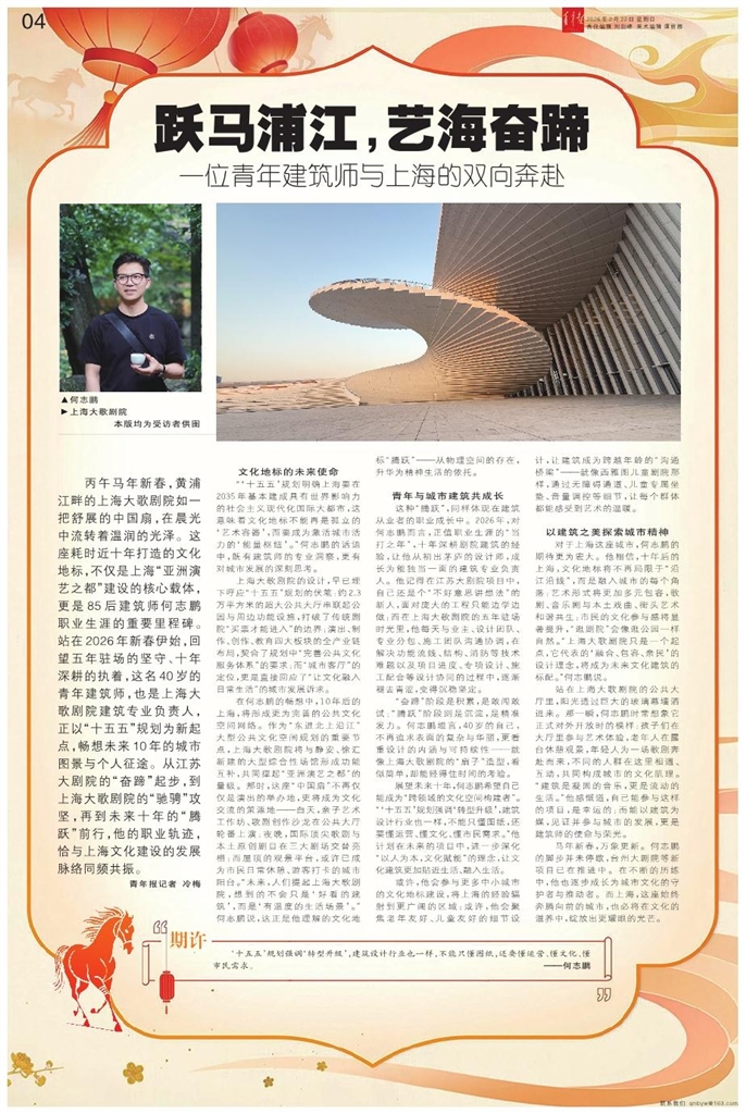 丙午马年新春,黄浦江畔的上海大歌剧院如一把舒展的中国扇,在晨光中流转着温润的光泽。这座耗时近十年打造的文化地标,不仅是上海“亚洲演艺之都”建设的核心载体,更是85后建筑师何志鹏职业生涯的重要里程碑