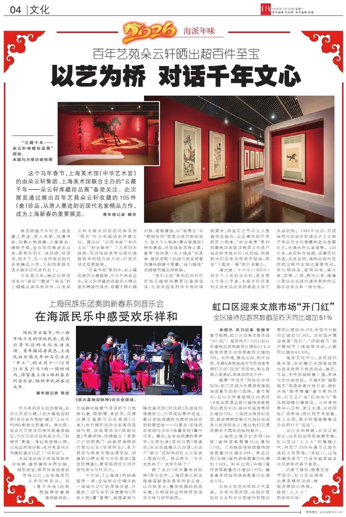 - 虹口区迎来文旅市场“开门红” 本报讯 见习记者 张振宇 春节假期,虹口区迎来文旅市场“开门红”!截至昨天(下同),虹口区接待总游客数同比增加51%,A级旅游景区总游客数同比增加39%。北外滩、鲁迅公园、和平公园、今潮8弄等地成