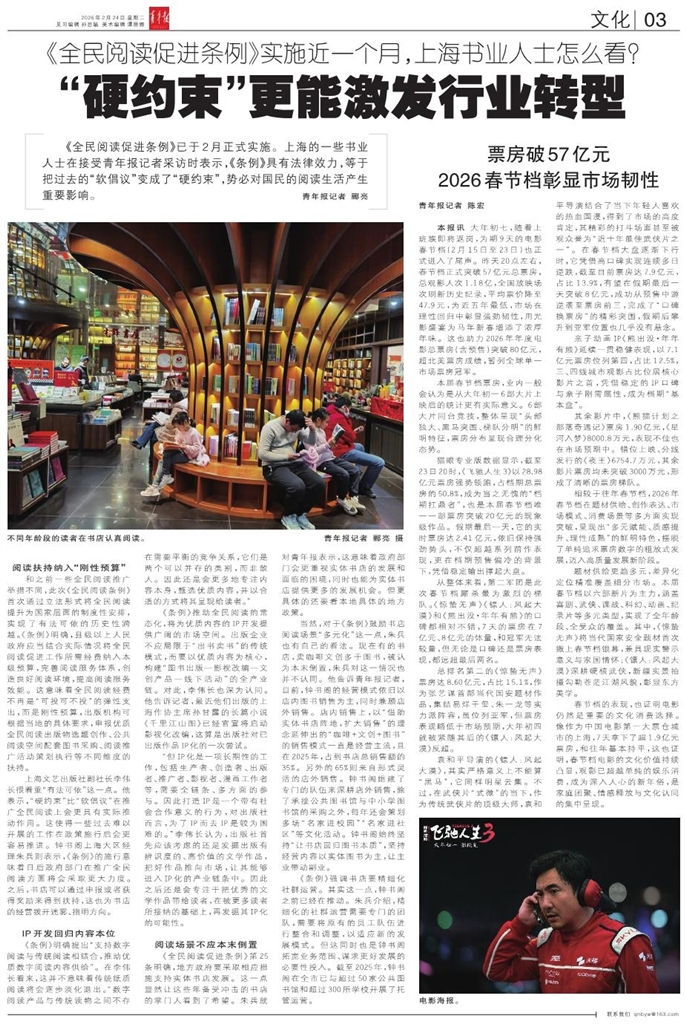 《全民阅读促进条例》已于2月正式实施。上海的一些书业人士在接受青年报记者采访时表示,《条例》具有法律效力,等于把过去的“软倡议”变成了“硬约束”,势必对国民的阅读生活产生重要影响。青年报记者 郦亮