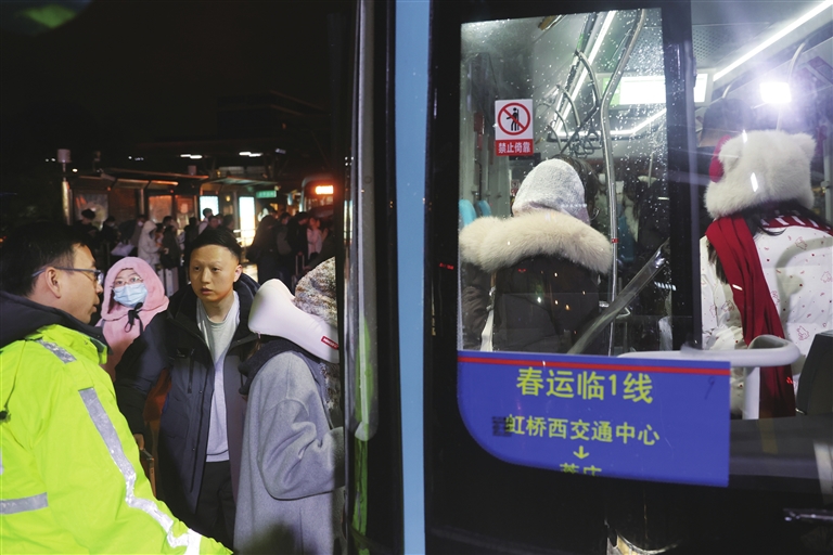 1:00,虹桥西交通中心春运临时专线站台人头攒动。“不上车的靠边站一下,车来了”“小心脚,当心当心”……工作人员不停地大声提醒、维持秩序。这里有春运临1、3、4、5、7线,去往闵行、金山、奉贤、松江等不同方向,每当有车进站,大家就紧张地刷手机查看对应的线路,生怕乘错方向。
