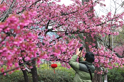“本来是锻炼身体,却很惊喜地发现早樱盛开。”退休了的张女士向记者表示。10点,公园就迎来了附近散步的居民,见到早樱如此繁盛,他们靠着花枝自拍起来。