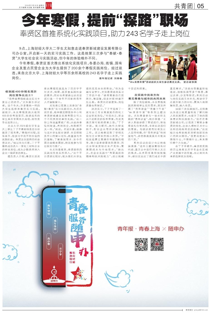 9点,上海财经大学大二学生尤知意走进奉贤新城建设发展有限公司办公室,开启新一天的实习实践工作。这是她第三次参与“奉献·奉贤”大学生社会实习实践活动,但今年的体验格外不同。 今年寒假,奉贤区首次