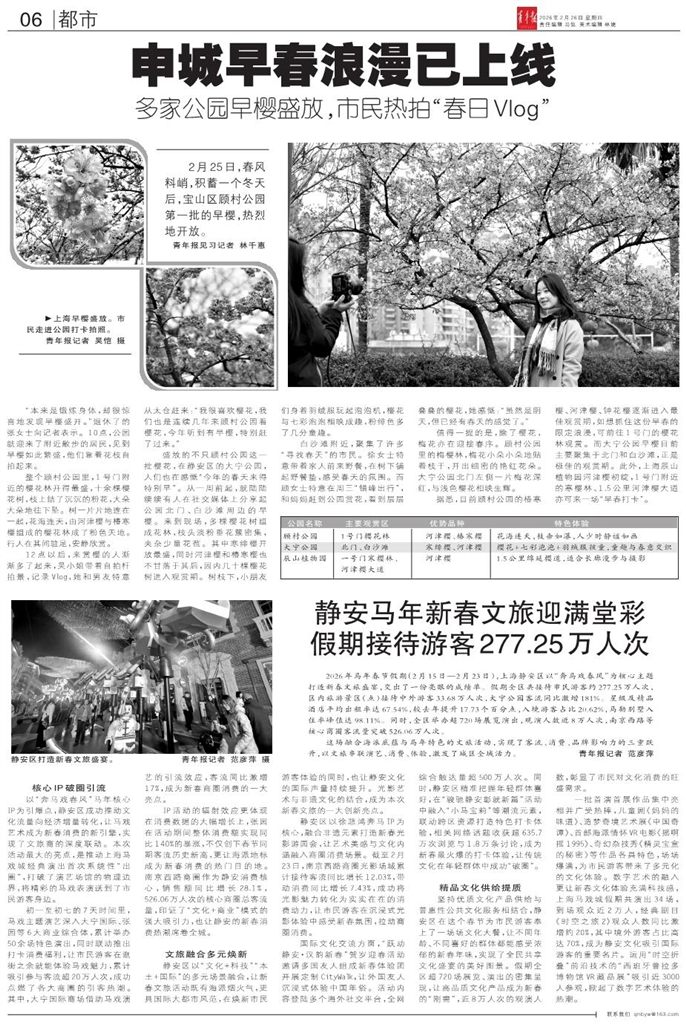 - 申城早春浪漫已上线 2月25日,春风料峭,积蓄一个冬天后,宝山区顾村公园第一批的早樱,热烈地开放。 青年报见习记者 林千惠 “本来是锻炼身体,却很惊喜地发现早樱盛开。”退休了的张女士向记者表示。10点,公园就