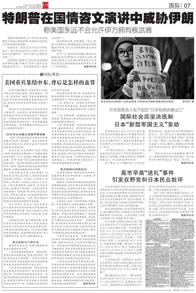 - 国际社会应坚决抵制日本“新型军国主义”妄动 外交部发言人毛宁2月25日就日本自民党有关松绑武器出口的最新动向答问时表示,中方对此表示严重关切。国际社会应携手捍卫二战胜利成果和战后国际秩序,坚决抵制日本“新型军国主义”妄动。 当日例行记者