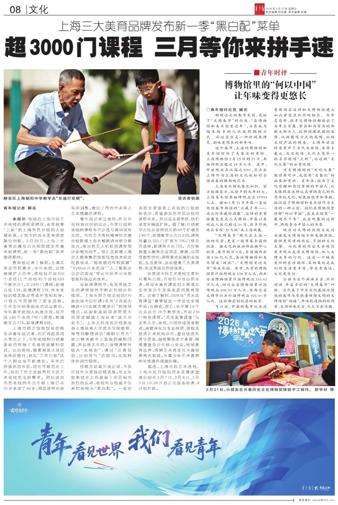 - 博物馆里的“何以中国”让年味变得更悠长 □青年报评论员 郦亮 刚刚过去的春节长假,见证了“文博春节”的热度。“在博物馆和美术馆里过年”,正在成为越来越多的人欢度假期的方式。而这显然是一种时间更持久、韵味更悠长的新年味。 这个春节