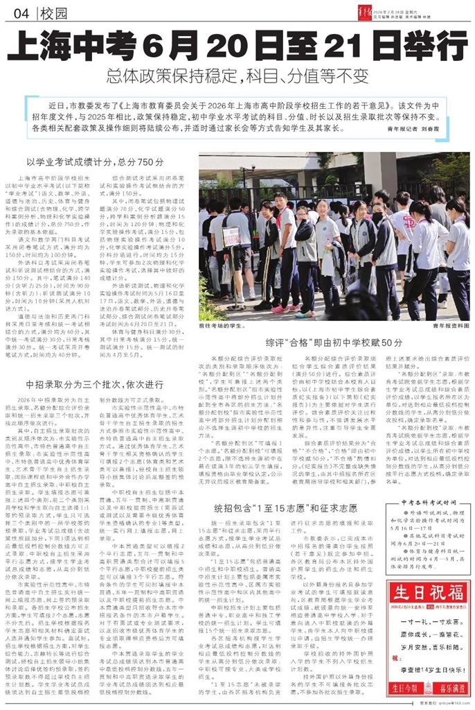 近日,市教委发布了《上海市教育委员会关于2026年上海市高中阶段学校招生工作的若干意见》。该文件为中招年度文件,与2025年相比,政策保持稳定,初中学业水平考试的科目、分值、时长以及招生录取批次等