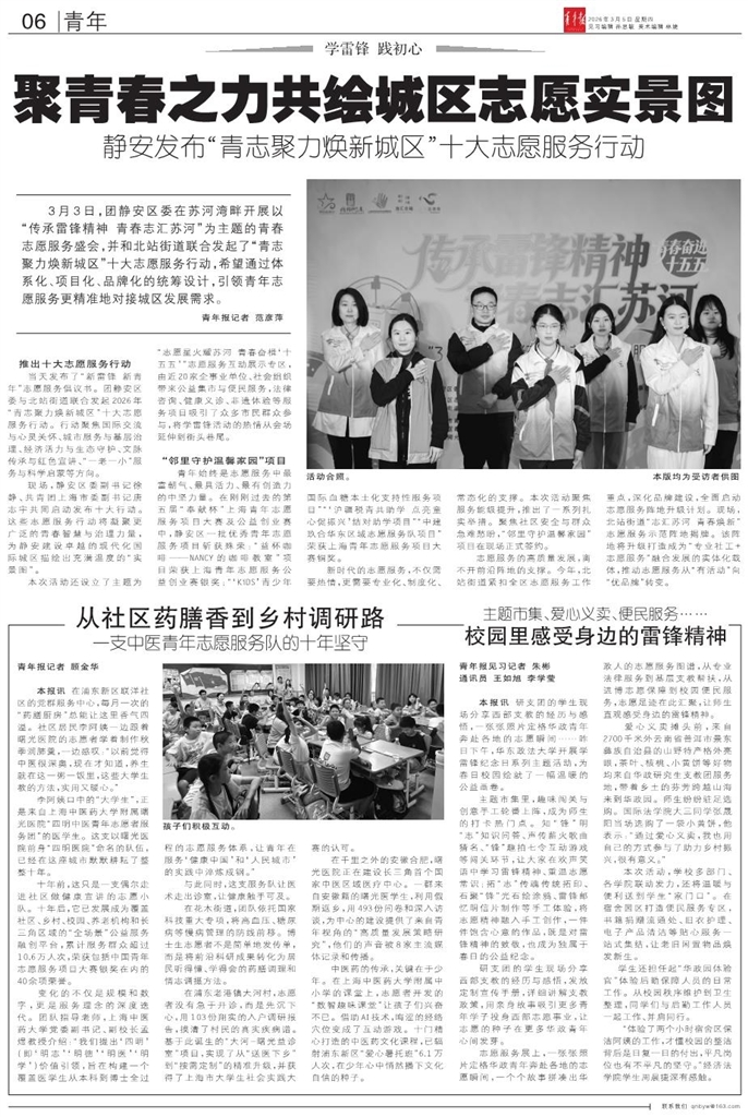 - 聚青春之力共绘城区志愿实景图 3月3日,团静安区委在苏河湾畔开展以“传承雷锋精神 青春志汇苏河”为主题的青春志愿服务盛会,并和北站街道联合发起了“青志聚力焕新城区”十大志愿服务行动,希望通过体系化、项目化、品牌化的统筹设计,引