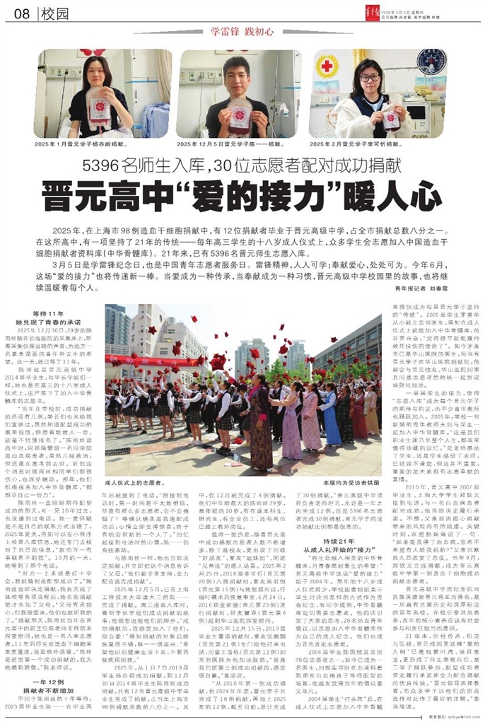 2025年,在上海市98例造血干细胞捐献中,有12位捐献者毕业于晋元高级中学,占全市捐献总数八分之一。在这所高中,有一项坚持了21年的传统——每年高三学生的十八岁成人仪式上,众多学生会志愿加入中国