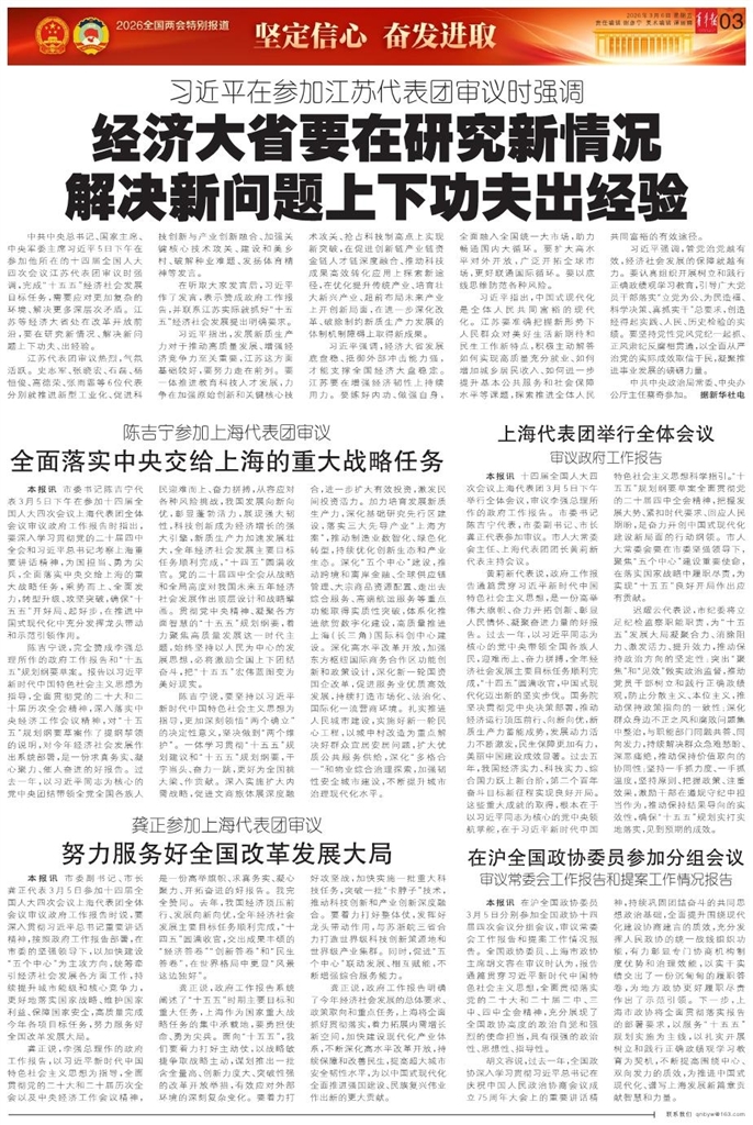 - 经济大省要在研究新情况解决新问题上下功夫出经验 中共中央总书记、国家主席、中央军委主席习近平5日下午在参加他所在的十四届全国人大四次会议江苏代表团审议时强调,完成“十五五”经济社会发展目标任务,需要应对更加复杂的环境、解决更多深层次矛盾。江苏等
