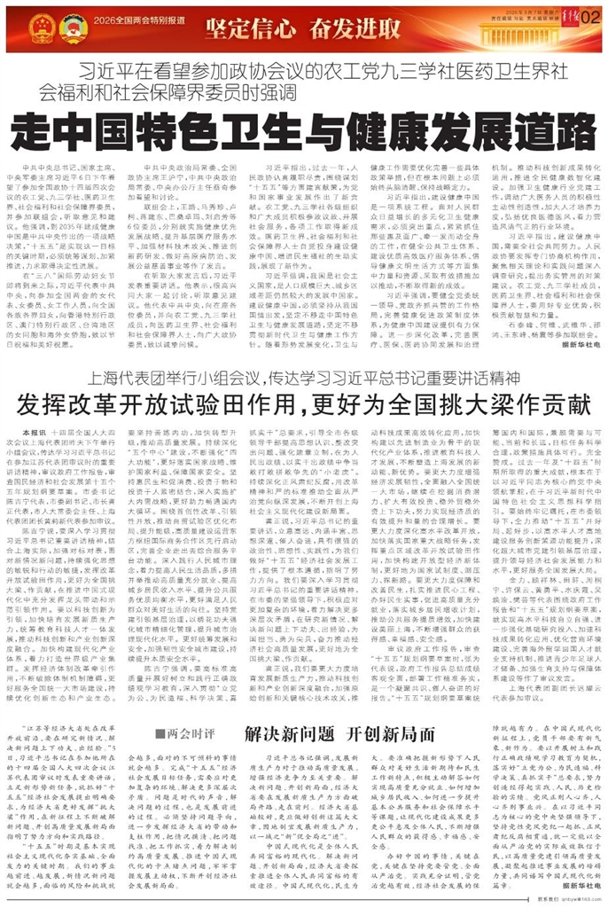- 走中国特色卫生与健康发展道路 中共中央总书记、国家主席、中央军委主席习近平6日下午看望了参加全国政协十四届四次会议的农工党、九三学社、医药卫生界、社会福利和社会保障界委员,并参加联组会,听取意见和建议。他强调,到2035年建成
