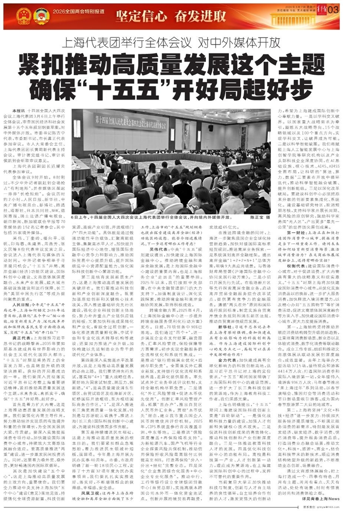 本报讯 十四届全国人大四次会议上海代表团3月6日上午举行全体会议,审查国民经济和社会发展第十五个五年规划纲要草案,对中外媒体开放。市委书记陈吉宁代表,市委副书记、市长龚正代表参加审议。市人大常委会