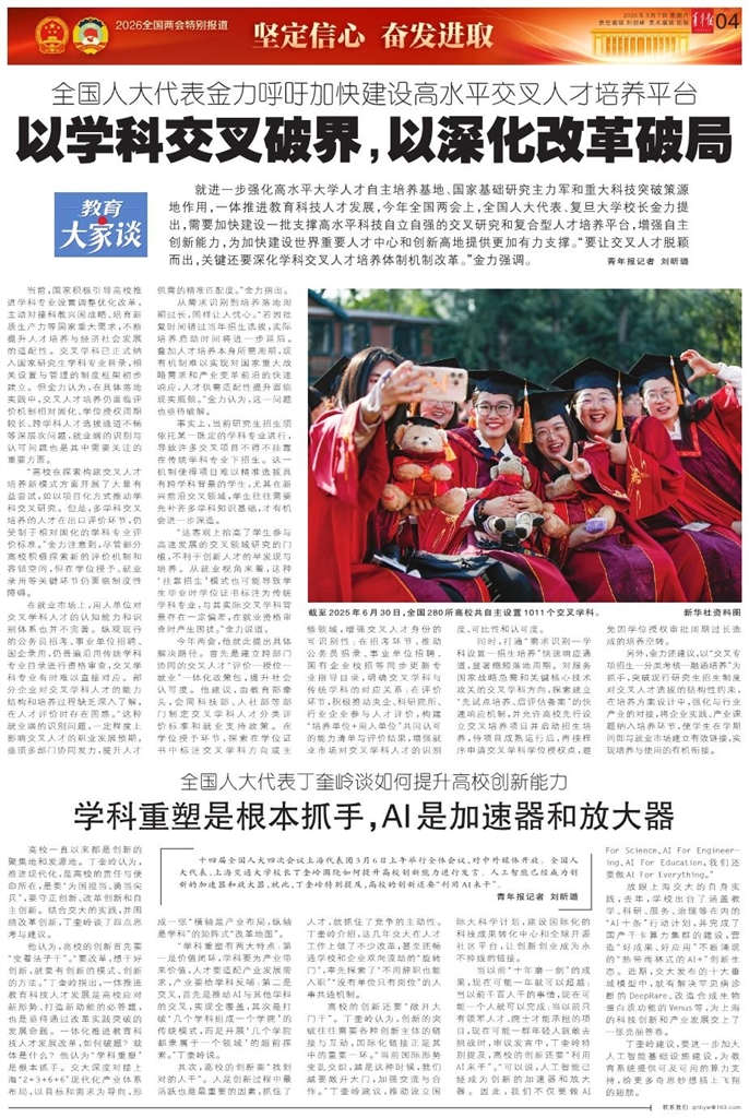 - 以学科交叉破界,以深化改革破局 就进一步强化高水平大学人才自主培养基地、国家基础研究主力军和重大科技突破策源地作用,一体推进教育科技人才发展,今年全国两会上,全国人大代表、复旦大学校长金力提出,需要加快建设一批支撑高水平科技自立