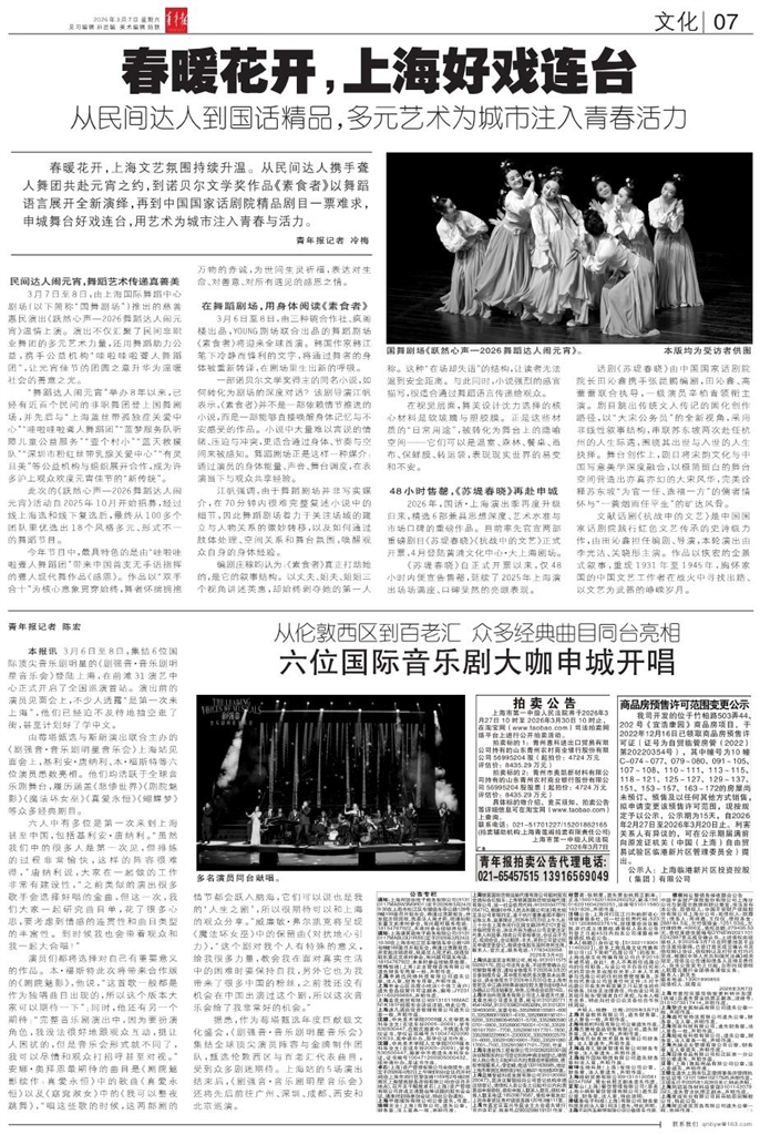 - 春暖花开,上海好戏连台 春暖花开,上海文艺氛围持续升温。从民间达人携手聋人舞团共赴元宵之约,到诺贝尔文学奖作品《素食者》以舞蹈语言展开全新演绎,再到中国国家话剧院精品剧目一票难求,申城舞台好戏连台,用艺术为城市注入青春与