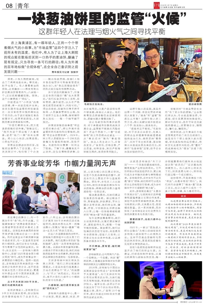 - 一块葱油饼里的监管“火候” 在上海黄浦区,有一群年轻人,正用一个个带着烟火气的小故事,为“市场监管”这四个字注入了前所未有的温度。他们中,有人为了让上海大剧院的观众能在散场后买到一口热乎的葱油饼,翻遍了现有规定,只为寻找一条