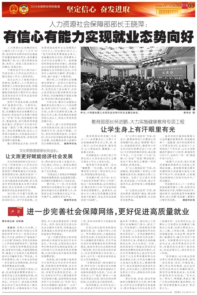 - 让文旅更好赋能经济社会发展 文化和旅游部部长孙业礼7日在十四届全国人大四次会议民生主题记者会上表示,文化和旅游部门将聚焦建设文化强国、旅游强国目标,编制实施好“十五五”文化和旅游发展的规划,主动对接国家发展战略,把文旅放在党