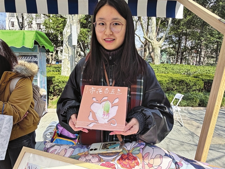 作为2026上海国际花卉节徐汇区分会场的首个联动活动,昨日在徐家汇公园举办的一场以“玉兰绽艺韵·文创汇申城”为主题的白玉兰文创市集上,已经有不少高校师生带来了原创的白玉兰文创产品。东华大学研三学生杨雯带来了一本手绘本——主角“小兰”正牵着小朋友的手,漫步在上海的街巷。这个被拟人化的白玉兰IP,传达了她画绘本的一个初衷:“让更多年轻人、小朋友了解市花白玉兰,也读懂它背后直立向上、奋勇争先的‘上海精神’。”
