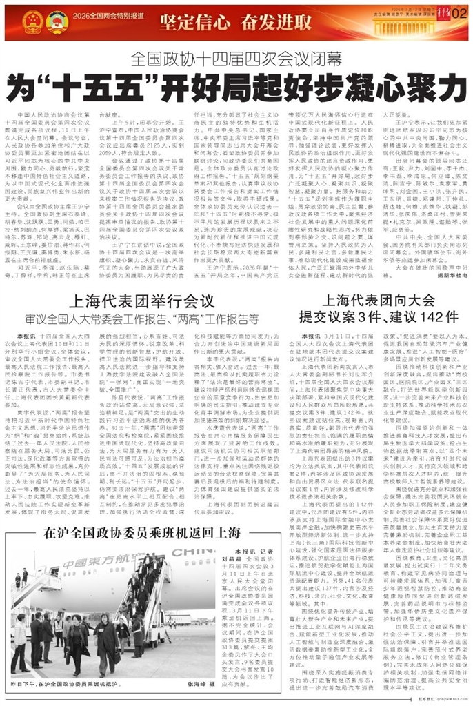 - 在沪全国政协委员乘班机返回上海 本报讯 记者 刘晶晶 全国政协十四届四次会议3月11日上午在北京人民大会堂闭幕。出席会议的在沪全国政协委员圆满完成会议各项议程,3月11日下午乘班机返回上海。据不完全统计,会议期间,在沪全国政协委