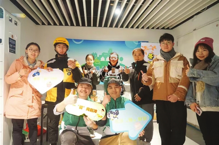 于是在去年冬天,一场由团支部发起的冬日接力“送温暖”活动悄然展开。赵甜甜和伙伴们顶着寒风,在临时停放点旁举起手卡:“来疏导点位停车,赠送防寒小礼品!”一周时间里,他们募集到加绒口罩、连脖毛帽、护具等百余件物资,一份份送到骑手手中。