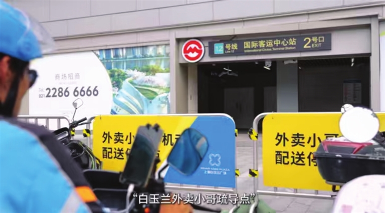 “硬规定”配上“软引导”,效果立竿见影。但团支部的年轻人并没有止步——他们发现,即使有了专属停车位,很多第一次来白玉兰广场送餐的骑手依然会“迷路”。商场里光星巴克就不止一家,很多位于角落中的餐馆,骑手们常常要绕一大圈。