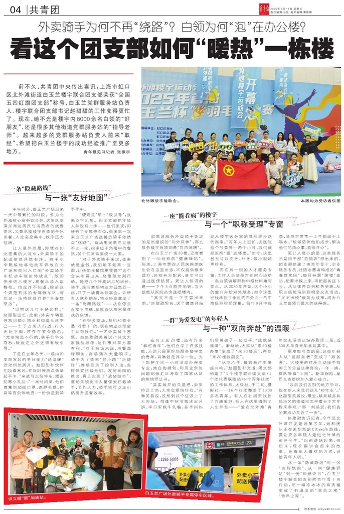 前不久,共青团中央传出喜讯:上海市虹口区北外滩街道白玉兰楼宇联合团支部荣获“全国五四红旗团支部”称号,白玉兰党群服务站负责人、楼宇联合团支部书记赵甜甜的工作变得更忙了。现在,她不光是楼宇内8000