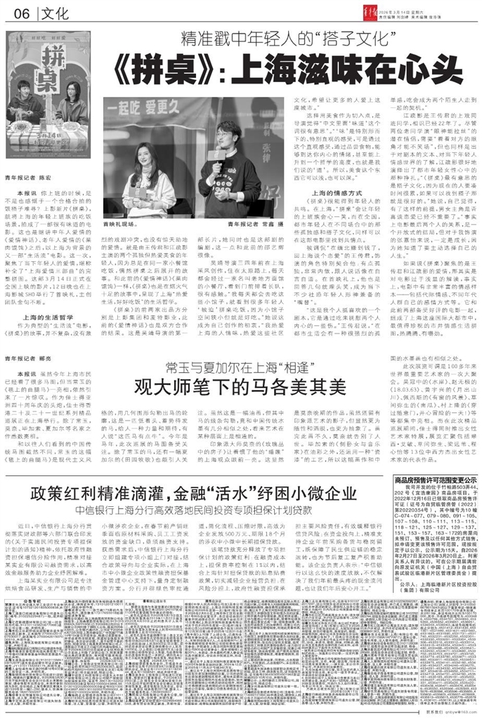 - 《拼桌》:上海滋味在心头 青年报记者 陈宏 本报讯 你上班的时候,是不是也感慨于一个合格合拍的饭搭子难寻?上影新片《拼桌》,就将上海的年轻上班族的吃饭场景,拍成了一部很有味道的电影。这也是继讲中年人爱情的《爱情神话》、