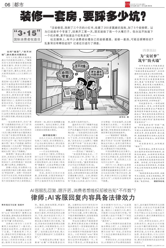 - 律师:AI客服回复内容具备法律效力 青年报见习记者 张振宇 本报讯 你有过被AI客服气到“吐血”的时候吗?随着AI技术的演进,越来越多的客服岗位正在被AI接管。但AI,很多时候却“听不懂”消费者的话。 消费者小郭今年1月在苹