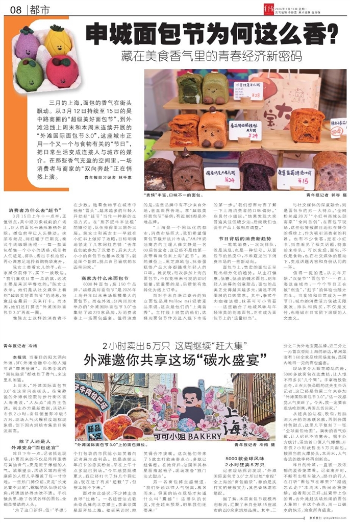 - 申城面包节为何这么香? 三月的上海,面包的香气在街头飘动。从3月12日持续至15日的吴中路商圈的“超级美好面包节”,到外滩沿线上周末和本周末连续开展的“外滩国际面包节3.0”,这座城市正用一个又一个与食物有关的“节日”,