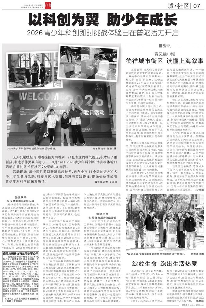 - 以科创为翼 助少年成长 无人机缓缓起飞,顺着操控方向看到一张张专注的稚气脸庞;积木错了重新搭,非遗手作更要有耐心……3月14日,2026青少年科创即时挑战体验日活动在普陀区长征社区文化活动中心举行。 活动现场,每个项