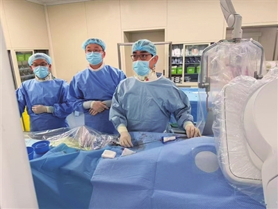 当天夜里,血管外科冯家烜主任医师团队,为危在旦夕的Luis实施了“肠系膜上动脉支架置入术”。手术团队将导丝穿过被严重压闭的血管腔直达远端,随后进行球囊扩张,精准释放3 枚支架,撑开了原本已经闭塞的肠系膜上动脉血流通道。