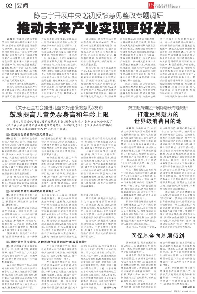 - 推动未来产业实现更好发展 本报讯 市委书记陈吉宁昨天下午围绕推动我市未来产业发展,开展中央巡视反馈意见整改专题调研。陈吉宁指出,要深入学习贯彻党的二十届四中全会精神和习近平总书记关于培育发展未来产业的重要论述,按照全国两会