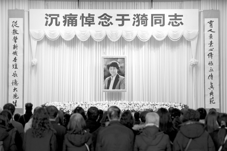 昨天上午,龙华殡仪馆大厅内庄重肃穆、哀乐低回,于漪同志的遗体覆盖着中国共产党党旗,安卧在鲜花丛中。市领导陈吉宁、龚正、黄莉新、胡文容等送花圈表示哀悼。朱忠明、解冬等向于漪同志遗体三鞠躬,作最后送别。有关部门和单位负责同志,于漪同志亲属、同事、学生、生前友好及各界人士也前往送别。