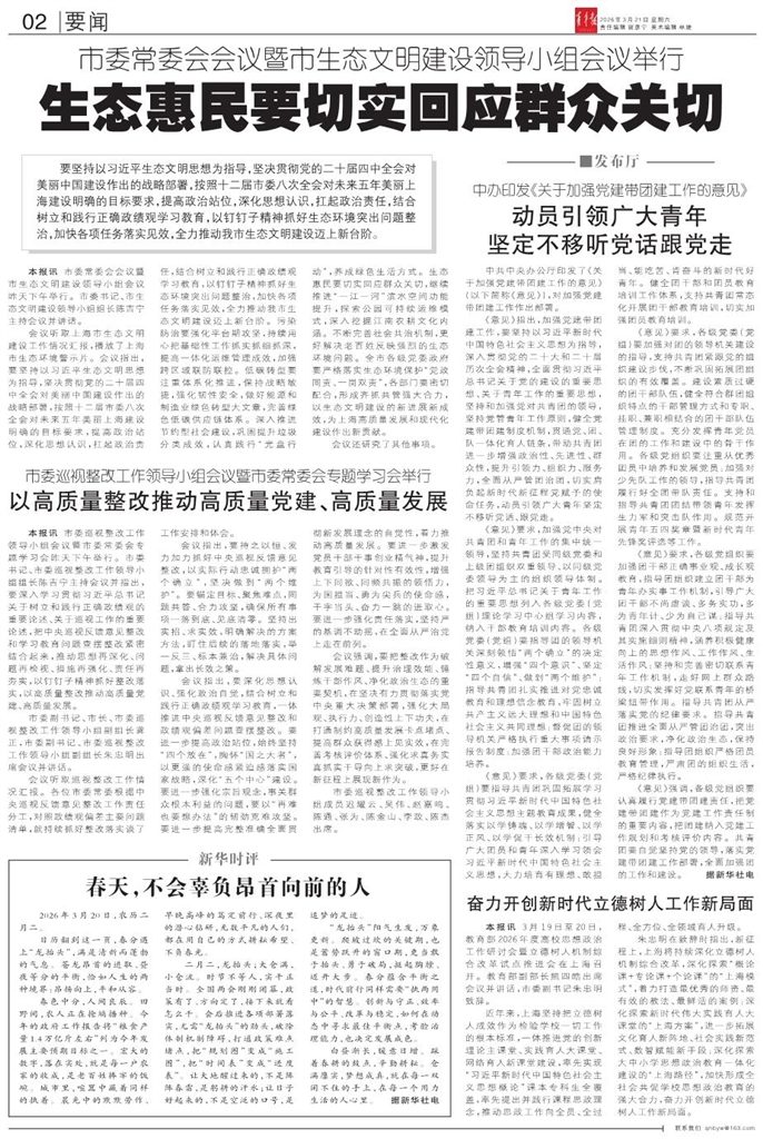 - 奋力开创新时代立德树人工作新局面 本报讯 3月19日至20日,教育部2026年度高校思想政治工作研讨会暨立德树人机制综合改革试点推进会在上海召开。教育部副部长熊四皓出席会议并讲话,市委副书记朱忠明致辞。 近年来,上海坚持把立德