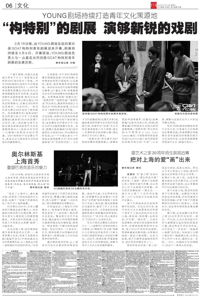 - “构特别”的剧展 演够新锐的戏剧 3月19日晚,由YOUNG剧场发起的第四届GOAT构特别青年剧展迎来开幕,剧展将持续至4月6日。开幕现场,YOUNG剧场负责人与一众嘉宾共同回顾GOAT构特别青年剧展的发展历程。青年报记者 冷梅